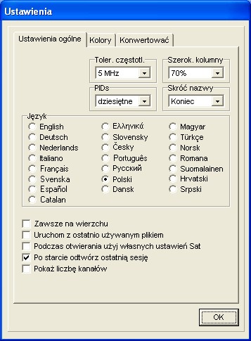 Tutaj możecie wybrać język menu, konfigurację portów, zdecydować czy chcecie widzieć/ wprowadzać PIDs w systemie dziesiętnym, czy szesnastkowym, wprowadzić tolerancję częstotliwości, umieścić okno edytora na wierzchu albo zmienić kolory zaznaczeń na listach.