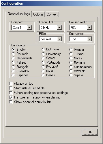 Here you can choose the menu language, configure the communication ports, choose if you like to see/enter PIDs in decimal or hexadecimal, enter the frequency tolerance for the import, keep the editor always on top or change the colors of the list items.