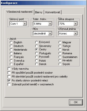 Zde mŭžete změnit jazyk menu, nakonfigurovat komunikační bránu, chcete-li vidět/zadat PIDs v desítkové či šestnáctkové soustavě, zadat frekvenci, toleranci pro import, umístit okno editoru vždy v horní části nebo změnit barvy jednotlivých položek seznamu.