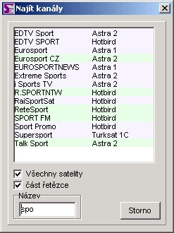 Hlavní okno, zde vidíte všechny satelity, transpondéry, FAV, a samozřejmě kanály
