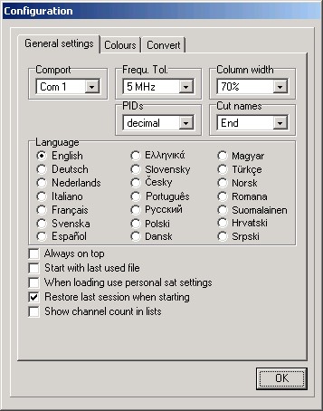 Here you can choose the menu language, configure the communication ports, choose if you like to see/enter PIDs in decimal or hexadecimal, enter the frequency tolerance for the import, keep the editor always on top or change the colors of the list items.