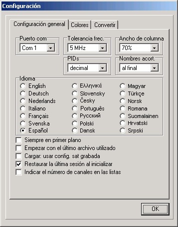 Aquí puede elegir el idioma del menú, configurar los puertos de comunicacóin, elegir si quiere ver/introducer PIDs en decimal o hexadecimal, introducer la tolerancia de frecuencia para la importación, mantener el editor siempre en pantalla o cambiar los colores en la lista de objetos.