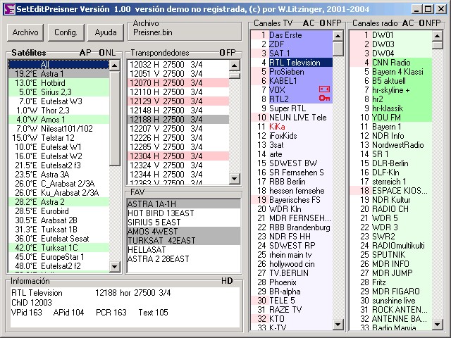 La ventana principal con la lista de satétites, Transpondedores, favoritos, y los canales.