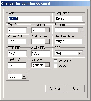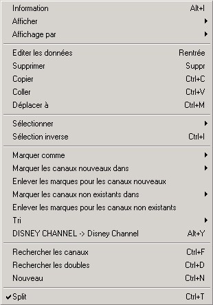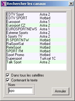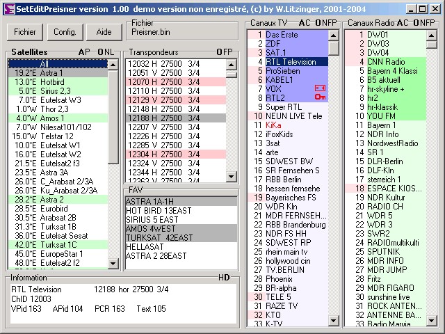 La fentre principale, vous voyez tous les satellites, transpondeurs, FAV, et naturellement les canaux.