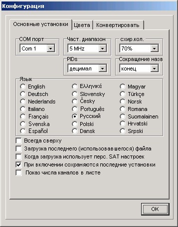 Здесь Вы можете выбрать язык меню, интерфейс, изображение PID, настройки листа каналов, задать допустимое отклонение частоты для импорта неизвестных форматов. Кроме того, вы можете здесь изменить шрифт и фон.