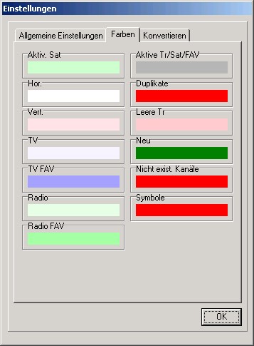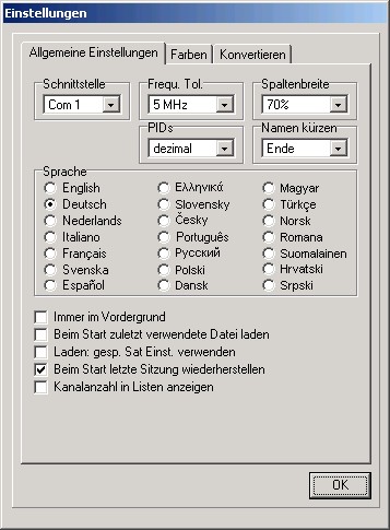 Hier werden die Menüsprache, die Schnittstelle, die Darstellung der PIDs und der Kanalliste eingestellt und eine Frequenztoleranz für den Import von Fremdformaten eingegeben. Außerdem können Sie hier die Schrift- und Hintergrundfarben von SetEdit verändern.