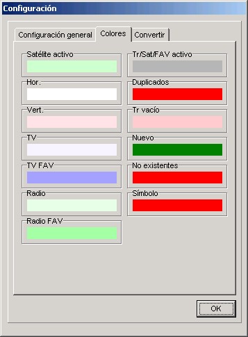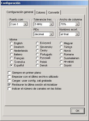 Aquí puede elegir el idioma del menú, configurar los puertos de comunicacóin, elegir si quiere ver/introducer PIDs en decimal o hexadecimal, introducer la tolerancia de frecuencia para la importación, mantener el editor siempre en pantalla o cambiar los colores en la lista de objetos.