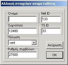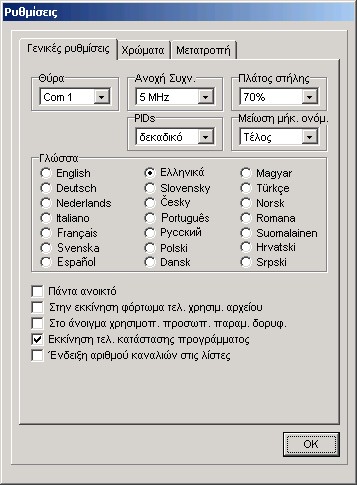 Εδώ μπορείτε να επιλέξετε γλώσσα, τη μορφή των PID (δεκαδική ή δεκαεξαδική) και της λίστας καναλιών, την ανοχή συχνότητας για την εισαγωγή άλλων μορφών(formats), και να ρυθμίσετε τα ports επικοινωνίας. Εξάλλου μπορείτε να αλλάξετε τη γραφή και τα χρώματα φόντου του SetEdit.