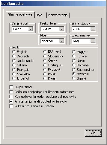 Ovdje možete izabrati izbornik za jezike, namjestiti portove za komuniciranje, izabrati ako želite vidjeti/unijeti u dekadskom ili heksadekadskom obliku, unijeti dozvoljenu frekvenciju za import, čuvati editor uvijek iznad svih ili promijeniti boje stavkama liste.