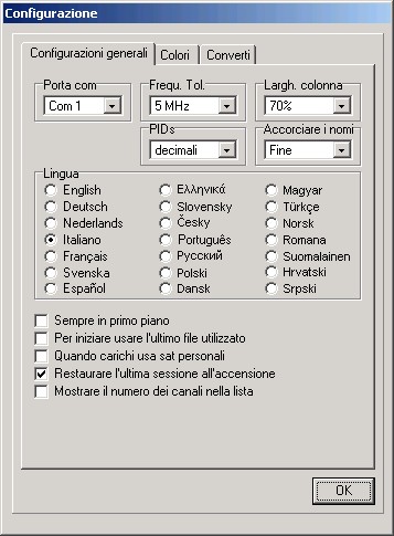 Da qui puoi scegliere il linguaggio del menu, configurare le porte di comunicazione, scegliere se preferisci vedere/inserire i PID in decimali o hexadecimali, inserire la tolleranza in frequenza per l'importazione, mantenere sempre l'editore in primo piano o cambiare i colori degli elementi della lista.