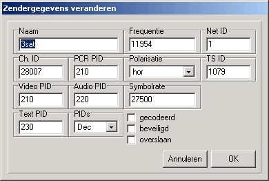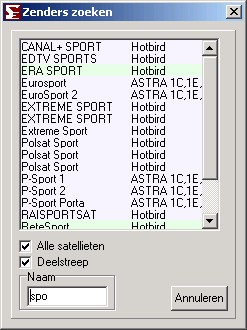 Het hoofdvenster, hier ziet u alle satellieten, transponders, en natuurlijk de zenders