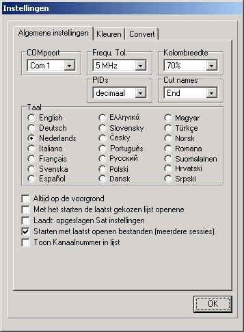 Hier worden de menutaal, de aansluitingen, de PID's en de in de zenderlijst aangeven frequentie tolerantie voor import van andere formaten. Daarnaast kunt u het schrijven veranderen en hier achtergrondkleuren van SetEdit