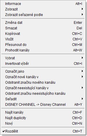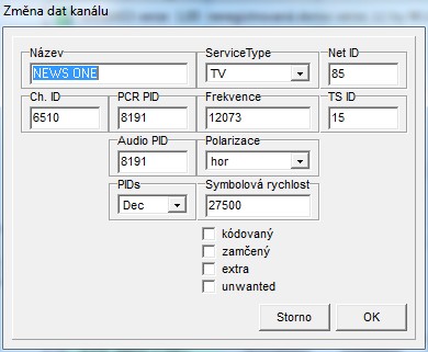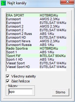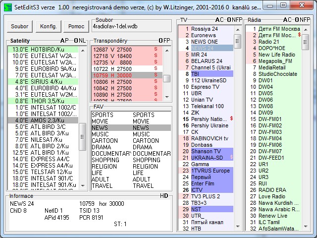 Hlavní okno, zde vidíte všechny satelity, transpondéry, FAV, a samozřejmě kanály