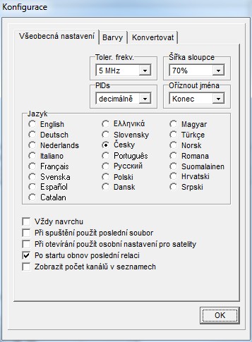 Zde mŭžete změnit jazyk menu, nakonfigurovat komunikační bránu, chcete-li vidět/zadat PIDs v desítkové či šestnáctkové soustavě, zadat frekvenci, toleranci pro import, umístit okno editoru vždy v horní části nebo změnit barvy jednotlivých položek seznamu.