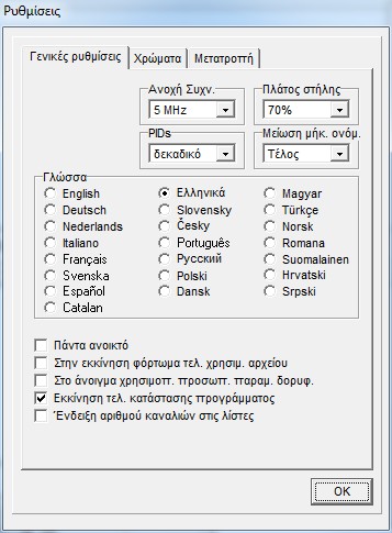 Εδώ μπορείτε να επιλέξετε γλώσσα, τη μορφή των PID (δεκαδική ή δεκαεξαδική) και της λίστας καναλιών, την ανοχή συχνότητας για την εισαγωγή άλλων μορφών(formats), και να ρυθμίσετε τα ports επικοινωνίας. Εξάλλου μπορείτε να αλλάξετε τη γραφή και τα χρώματα φόντου του SetEdit.