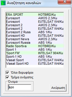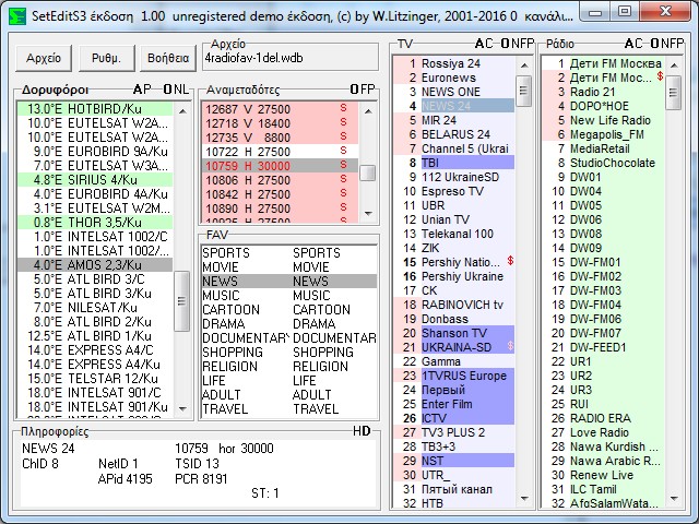 Το κυρίως παράθυρο, εδώ βρίσκονται: δορυφόροι, αναμεταδότες, αγαπημένα, και φυσικά τα κανάλια.