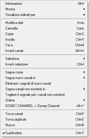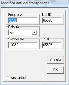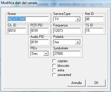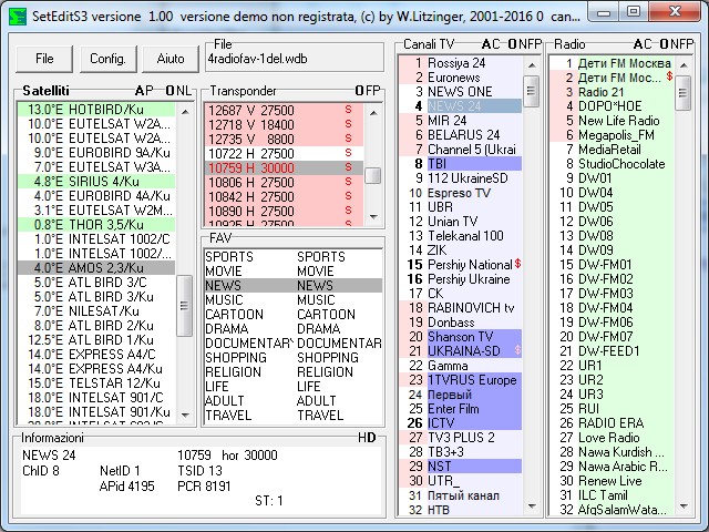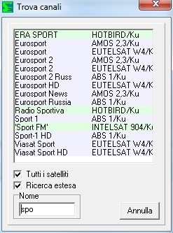 La finestra principale, vedi tutti i satellite, transponder, FAV, e naturalmente i canali.