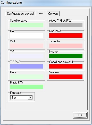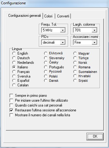 Da qui puoi scegliere il linguaggio del menu, configurare le porte di comunicazione, scegliere se preferisci vedere/inserire i PID in decimali o hexadecimali, inserire la tolleranza in frequenza per l'importazione, mantenere sempre l'editore in primo piano o cambiare i colori degli elementi della lista.