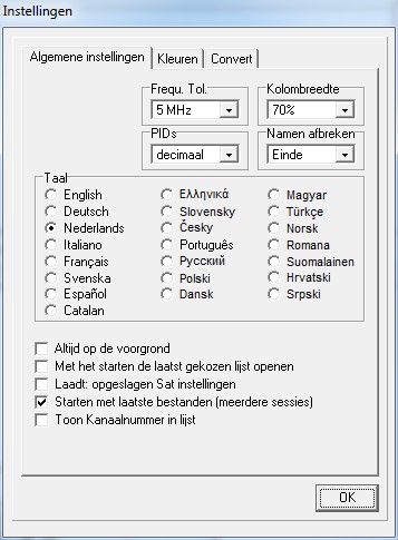 Hier worden de menutaal, de aansluitingen, de PID's en de in de zenderlijst aangeven frequentie tolerantie voor import van andere formaten. Daarnaast kunt u het schrijven veranderen en hier achtergrondkleuren van SetEdit