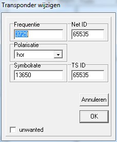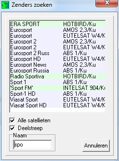 Het hoofdvenster, hier ziet u alle satellieten, transponders, Fav lijst, en natuurlijk de zenders