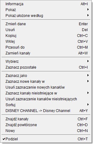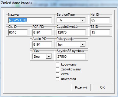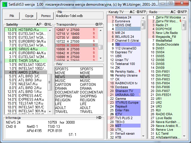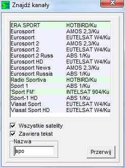 Okno główne, tutaj widzimy wszystkie satelity, transpondery, ulubione, i oczywiście kanały.