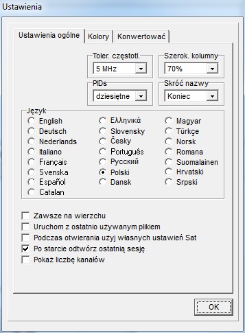 Tutaj możecie wybrać język menu, konfigurację portów, zdecydować czy chcecie widzieć/ wprowadzać PIDs w systemie dziesiętnym, czy szesnastkowym, wprowadzić tolerancję częstotliwości, umieścić okno edytora na wierzchu albo zmienić kolory zaznaczeń na listach.