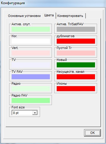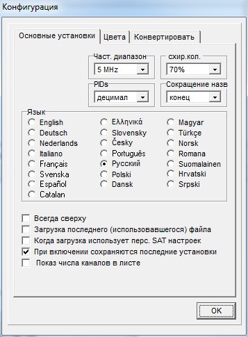 Здесь Вы можете выбрать язык меню, интерфейс, изображение PID, настройки листа каналов, задать допустимое отклонение частоты для импорта неизвестных форматов. Кроме того, вы можете здесь изменить шрифт и фон.