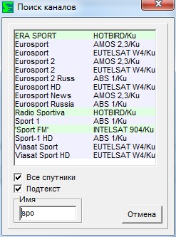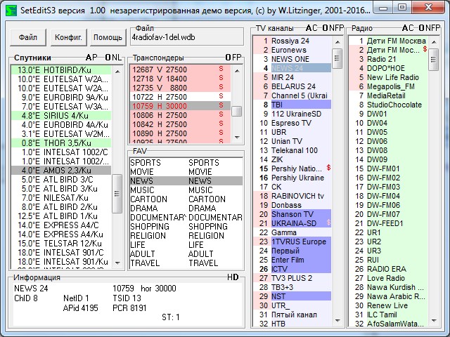Главное окно, здесь Вы видите все спутники, транспондера, FAV, и, конечно каналы