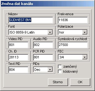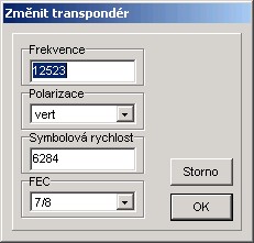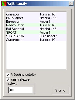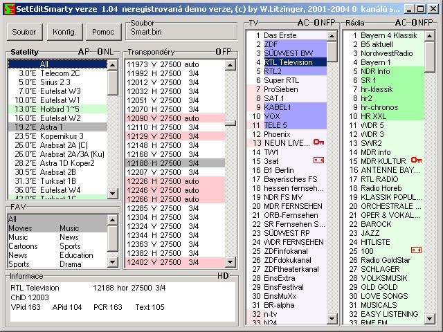 Hlavní okno, zde vidíte všechny satelity, transpondéry, FAV, a samozřejmě kanály