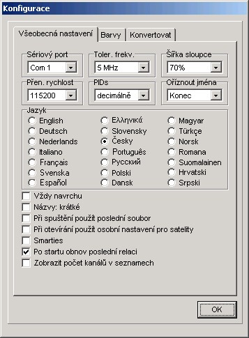 Zde mŭžete změnit jazyk menu, nakonfigurovat komunikační bránu, chcete-li vidět/zadat PIDs v desítkové či šestnáctkové soustavě, zadat frekvenci, toleranci pro import, umístit okno editoru vždy v horní části nebo změnit barvy jednotlivých položek seznamu.