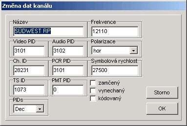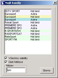Hlavní okno, zde vidíte všechny satelity, transpondéry, a samozřejmě kanály
