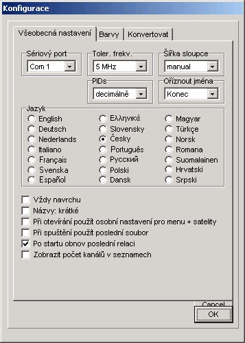 Zde mŭžete změnit jazyk menu, nakonfigurovat komunikační bránu, chcete-li vidět/zadat PIDs v desítkové či šestnáctkové soustavě, zadat frekvenci, toleranci pro import, umístit okno editoru vždy v horní části nebo změnit barvy jednotlivých položek seznamu.
