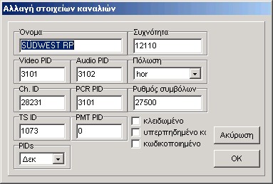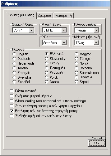 Εδώ μπορείτε να επιλέξετε γλώσσα, τη μορφή των PID (δεκαδική ή δεκαεξαδική) και της λίστας καναλιών, την ανοχή συχνότητας για την εισαγωγή άλλων μορφών(formats), και να ρυθμίσετε τα ports επικοινωνίας. Εξάλλου μπορείτε να αλλάξετε τη γραφή και τα χρώματα φόντου του SetEdit.