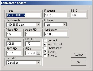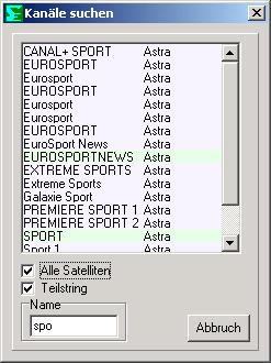 Das Hauptfenster, hier sehen Sie alle Satelliten, Transponder, Provider, Favoriten, und natürlich die Kanäle.