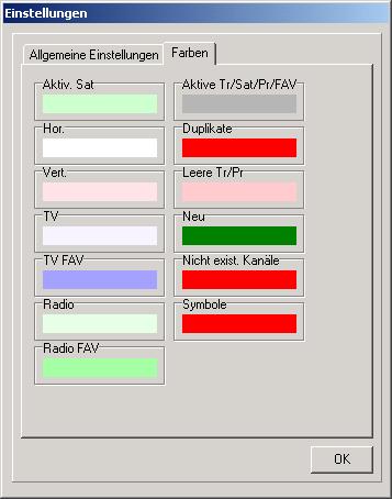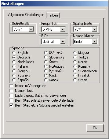 Hier werden die Menüsprache, die Schnittstelle, die Darstellung der PIDs und der Kanalliste eingestellt und eine Frequenztoleranz für den Import von Fremdformaten eingegeben. Außerdem können Sie hier die Schrift- und Hintergrundfarben von SetEdit verändern.