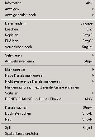 Das Hauptmenü der Kanalliste