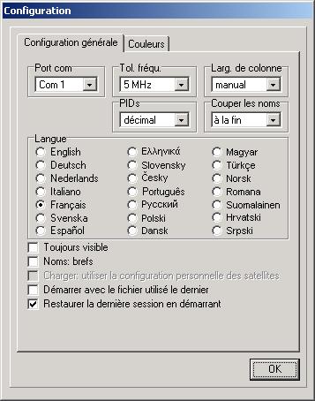 Ici vous pouvez choisir la langue du menu, choisir si vous voulez voir/entrer les PIDs en dcimal ou en hexadcimal, entrer la tolrance de la frquence pour l'import, changer les couleurs et entrer les donnes du rseau.