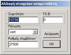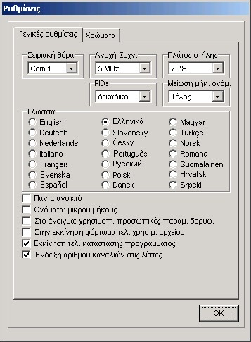 Εδώ μπορείτε να επιλέξετε γλώσσα, τη μορφή των PID (δεκαδική ή δεκαεξαδική) και της λίστας καναλιών, την ανοχή συχνότητας για την εισαγωγή άλλων μορφών(formats), και να ρυθμίσετε τα ports επικοινωνίας. Εξάλλου μπορείτε να αλλάξετε τη γραφή και τα χρώματα φόντου του SetEdit.
