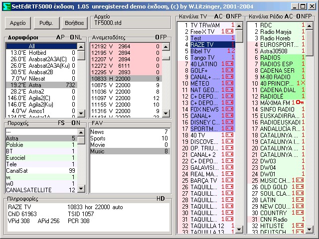 Το κυρίως παράθυρο, εδώ βρίσκονται: δορυφόροι, αναμεταδότες, παροχείς, αγαπημένα, και φυσικά τα κανάλια.