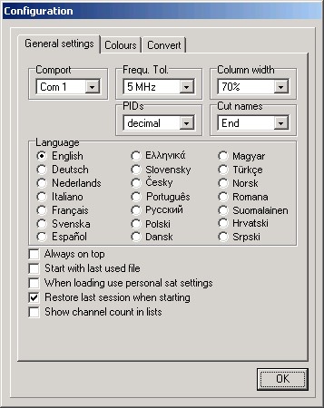 Here you can choose the menu language, configure the communication ports, choose if you like to see/enter PIDs in decimal or hexadecimal, enter the frequency tolerance for the import, keep the editor always on top or change the colors of the list items.