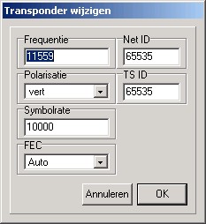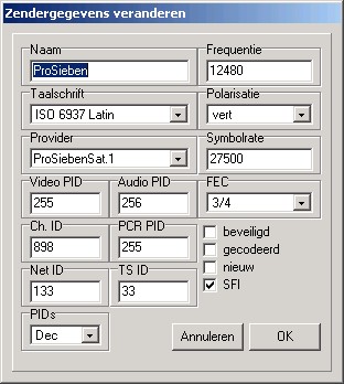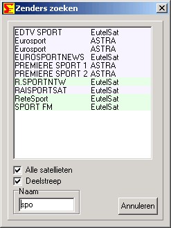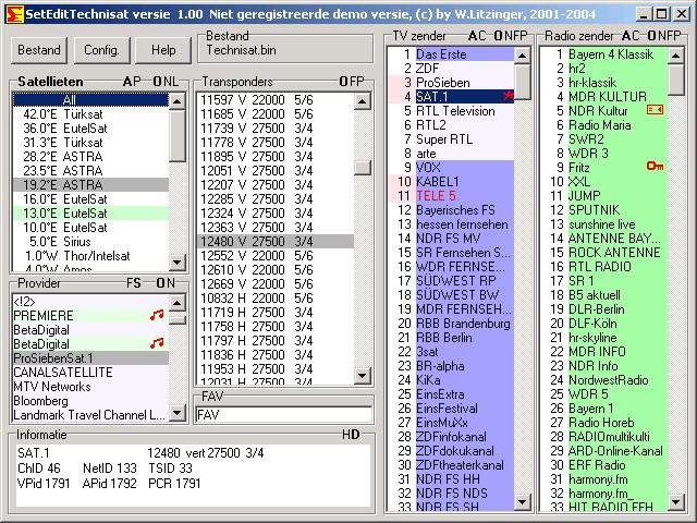 Het hoofdvenster, hier ziet u alle satellieten, transponders, provider, Fav lijst, en natuurlijk de zenders