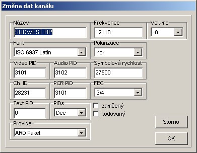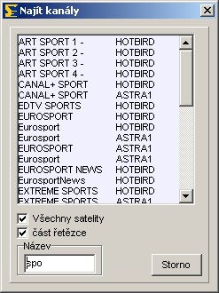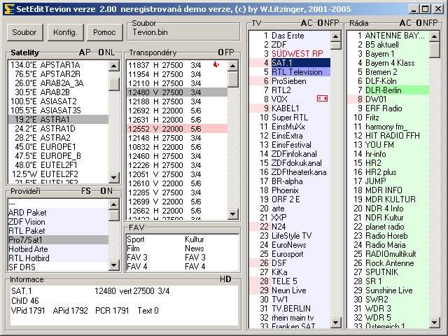 Hlavní okno, zde vidíte všechny satelity, transpondéry, provideri, FAV, žánr, a samozřejmě kanály