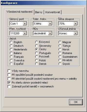 Zde mŭžete změnit jazyk menu, nakonfigurovat komunikační bránu, chcete-li vidět/zadat PIDs v desítkové či šestnáctkové soustavě, zadat frekvenci, toleranci pro import, umístit okno editoru vždy v horní části nebo změnit barvy jednotlivých položek seznamu.