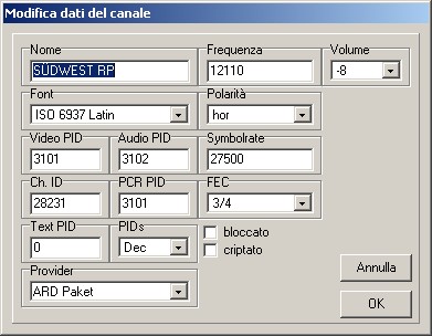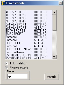 La finestra principale, vedi tutti i satellite, transponder, provider, FAV, genres, e naturalmente i canali.