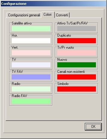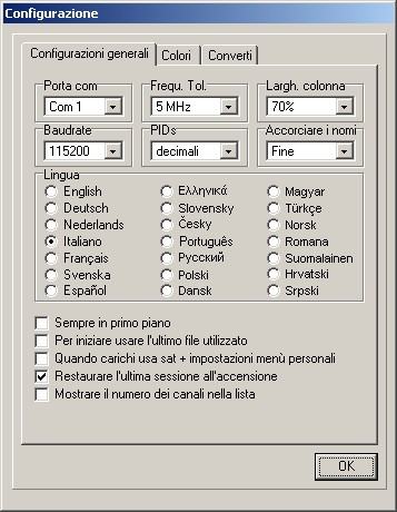 Da qui puoi scegliere il linguaggio del menu, configurare le porte di comunicazione, scegliere se preferisci vedere/inserire i PID in decimali o hexadecimali, inserire la tolleranza in frequenza per l'importazione, mantenere sempre l'editore in primo piano o cambiare i colori degli elementi della lista.