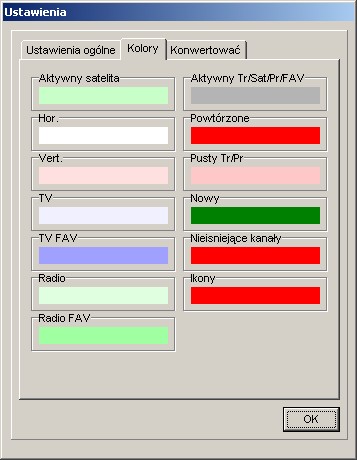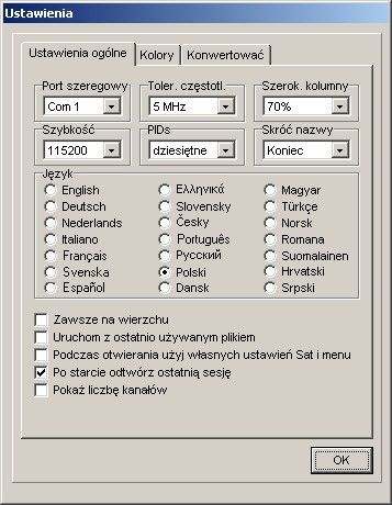 Tutaj możecie wybrać język menu, konfigurację portów, zdecydować czy chcecie widzieć/ wprowadzać PIDs w systemie dziesiętnym, czy szesnastkowym, wprowadzić tolerancję częstotliwości, umieścić okno edytora na wierzchu albo zmienić kolory zaznaczeń na listach.