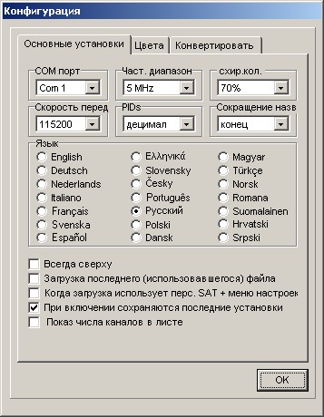 Здесь Вы можете выбрать язык меню, интерфейс, изображение PID, настройки листа каналов, задать допустимое отклонение частоты для импорта неизвестных форматов. Кроме того, вы можете здесь изменить шрифт и фон.