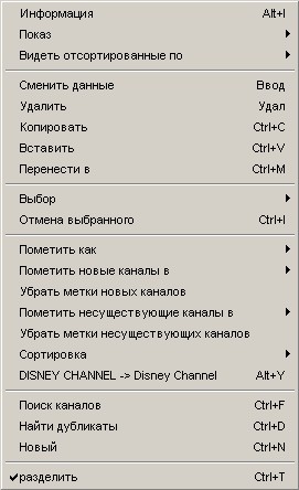 Главное меню листа каналов
