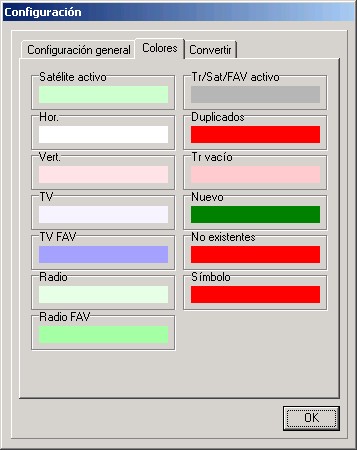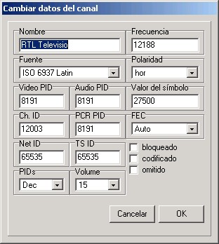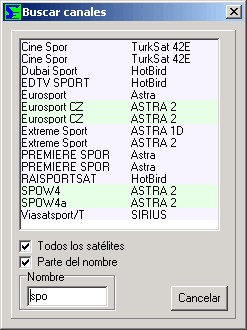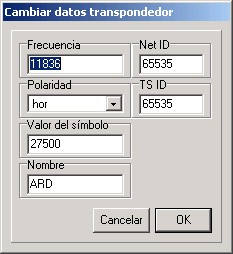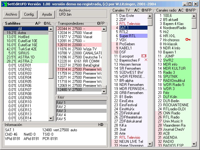 La ventana principal con la lista de satétites, Transpondedores, favoritos, y los canales.