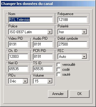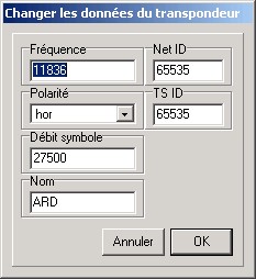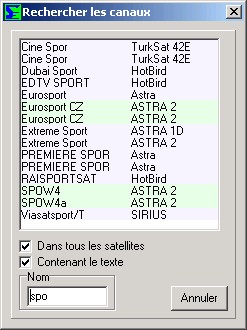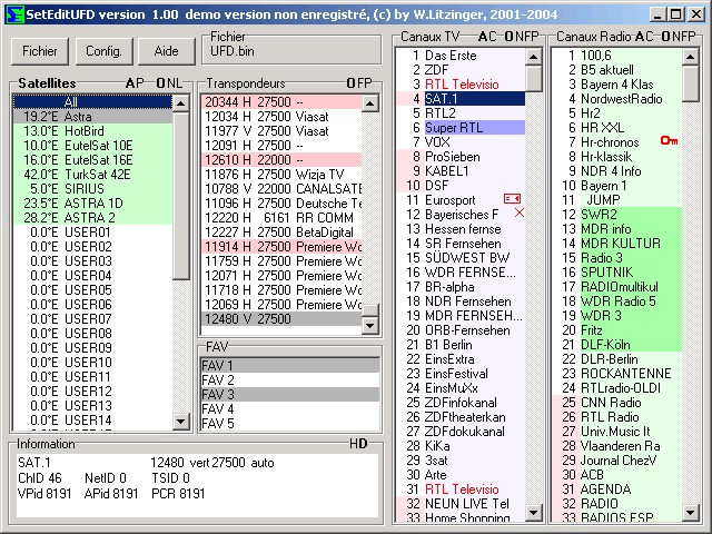 La fentre principale, vous voyez tous les satellites, transpondeurs, FAV, et naturellement les canaux.